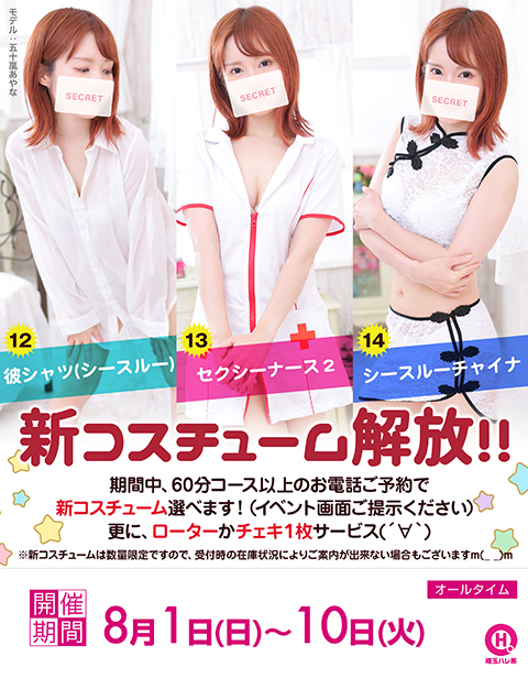 期間中、60分コース以上のお電話ご予約で新コスチューム選べます!(イベント画面ご提示ください)