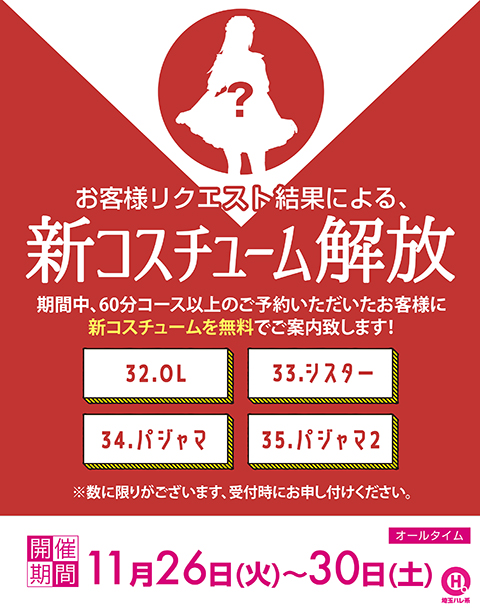 期間中、60分コース以上のご予約いただいたお客様に新コスチュームを無料でご案内致します!