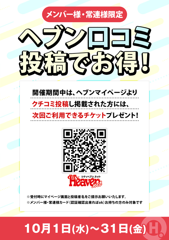 メンバー様・常連様限定/ヘブン口コミ 投稿でお得!