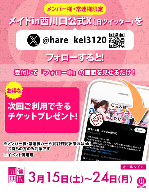 メンバー様・常連様限定/メイドin西川口公式X(旧ツイッター)をフォローすると!