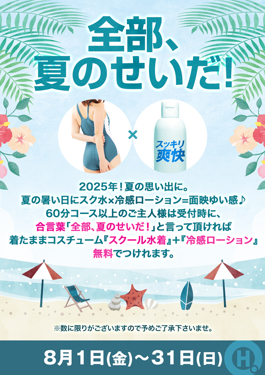 60分コース以上のご主人様は受付時に、合言葉「全部、夏のせいだ!」と言って頂ければ着たままコスチューム『スクール水着』+『冷感ローション』無料でつけれます。
