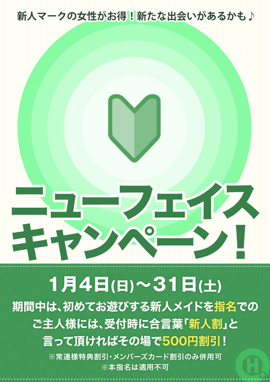 期間中は、初めてお遊びする新人メイドを指名でのご主人様には、受付時に合言葉「新人割」と言って頂ければその場で500円割引!