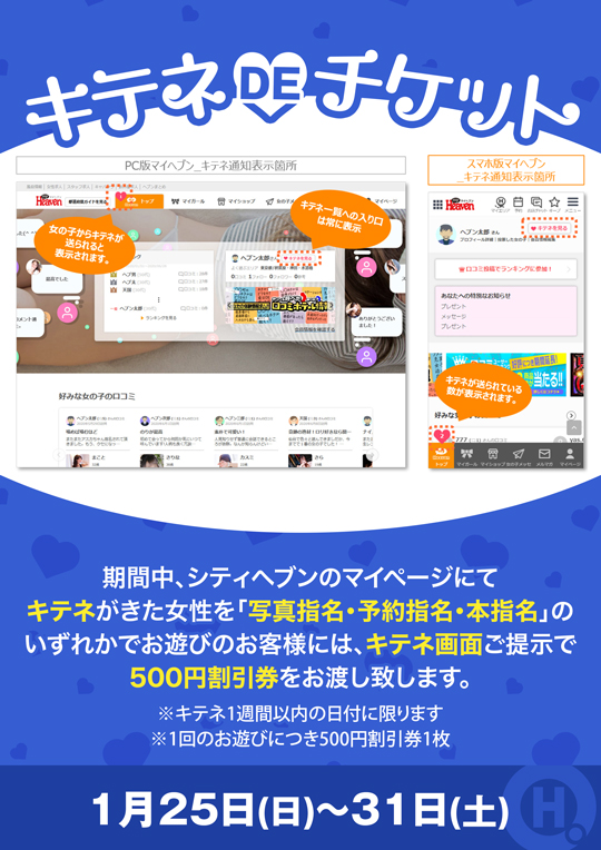 期間中、シティヘブンのマイページにてキテネがきた女性を「写真指名・予約指名・本指名」のいずれかでお遊びのお客様には、キテネ画面ご提示で500円割引券をお渡し致します。