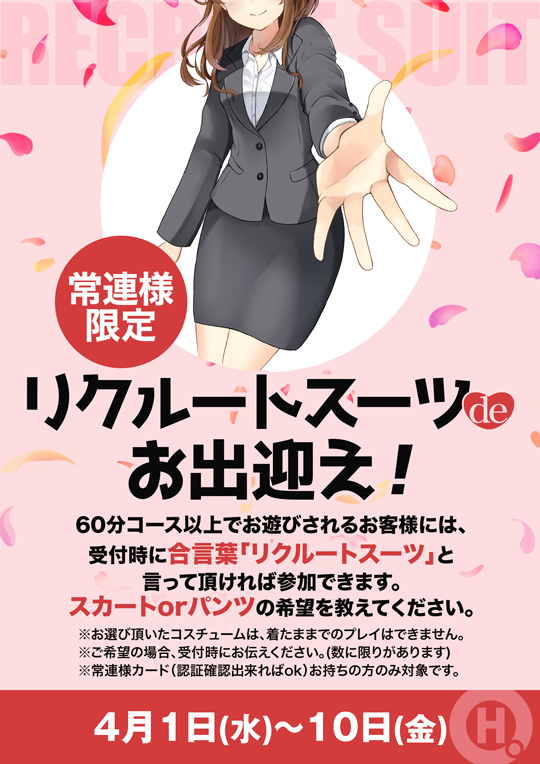 60分コース以上でお遊びされるお客様には、受付時に合言葉「リクルートスーツ」と言って頂ければ参加できます。