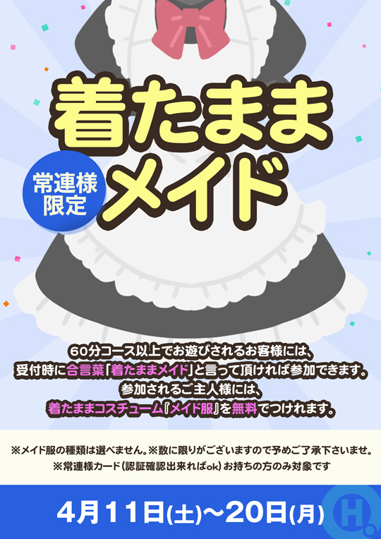 60分コース以上でお遊びされるお客様には、受付時に合言葉「着たままメイド」と言って頂ければ参加できます。
