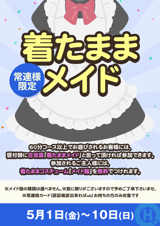 60分コース以上でお遊びされるお客様には、受付時に合言葉「着たままメイド」と言って頂ければ参加できます。