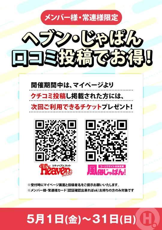 メンバー様・常連様限定/ヘブン・じゃぱん口コミ投稿でお得!